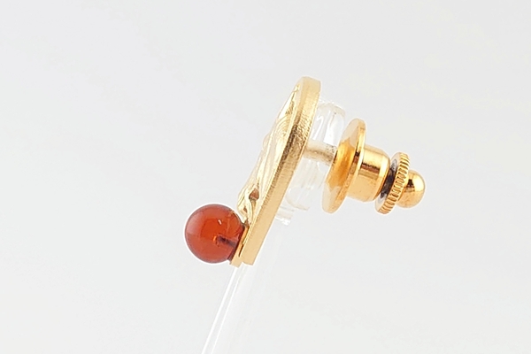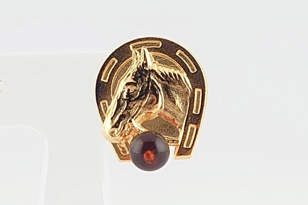 「成功」や「前進」を意味する馬のモチーフに、光を透かすワインカラーの海外産琥珀をあしらったタックブローチです。