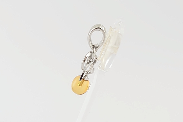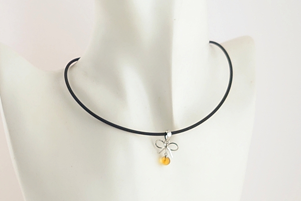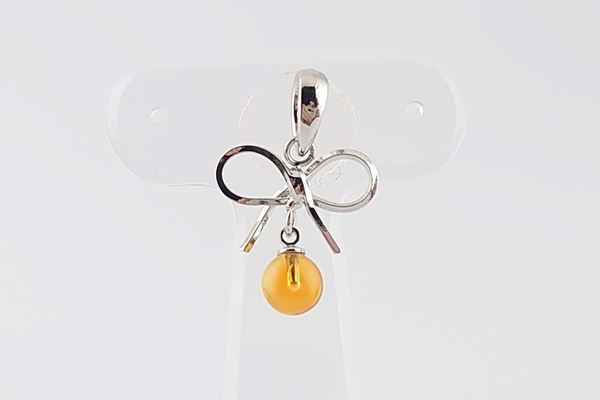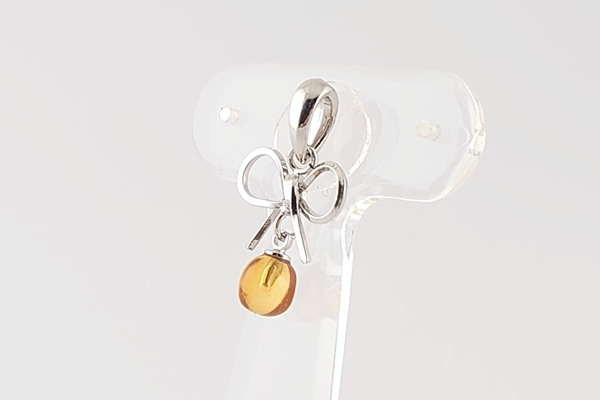 ペンダント(リボン):海外産琥珀、琥珀サイズ直径約5mm玉、金具込み縦約2cm、金具真鍮製(銀色メッキ)
