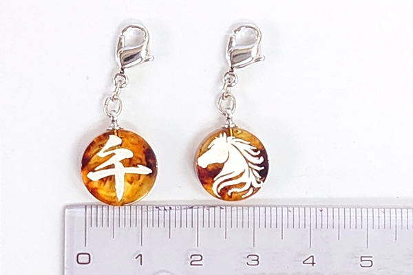 直径約1.5cmのリファインドアンバーに彫刻し、色を入れています。