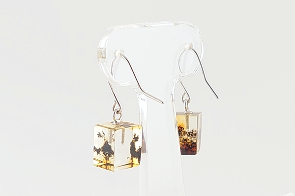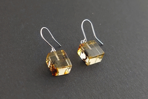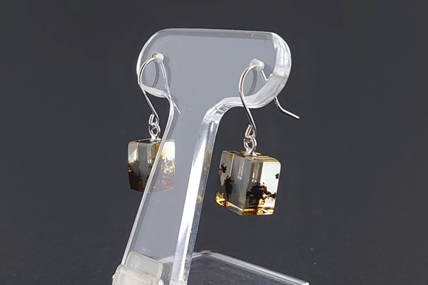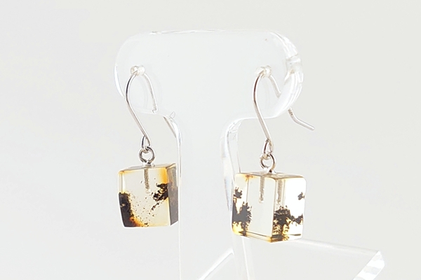 澄んだ色合いのシャンパンカラーの琥珀の中に、個性的な内包物が浮かぶ、海外産琥珀のピアスです。