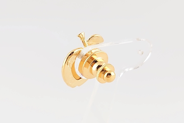キャラメルのようなミルキーカラーと、透明感のあるコニャックカラーの海外産琥珀を張り合わせにした、りんごモチーフのタックブローチです。