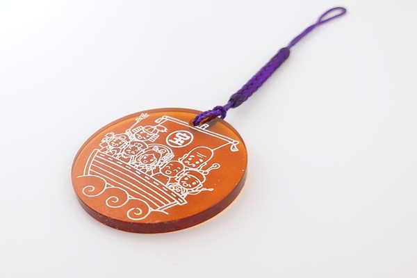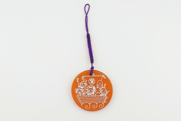 宝船に乗った七福神を彫刻した、丸い形の根付です。