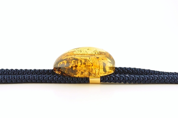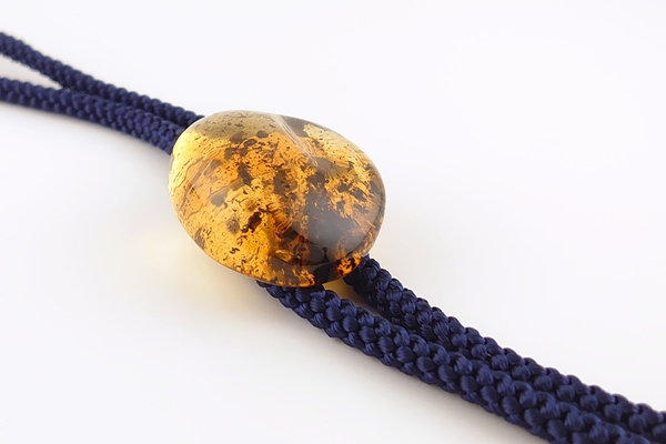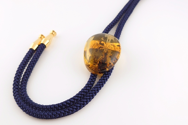 琥珀の色合いとのコントラストが楽しめる、紺色の紐を合わせています。