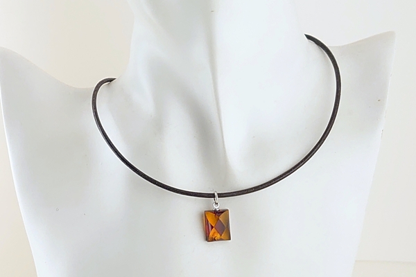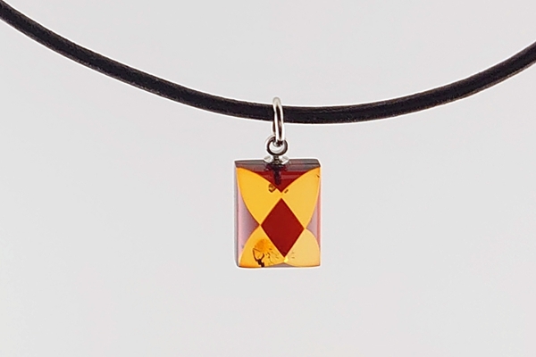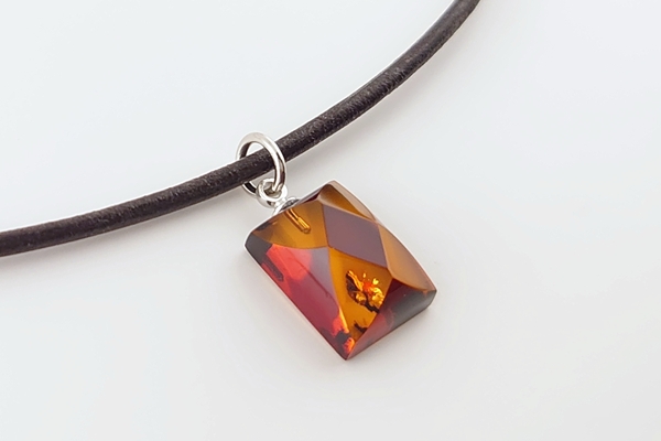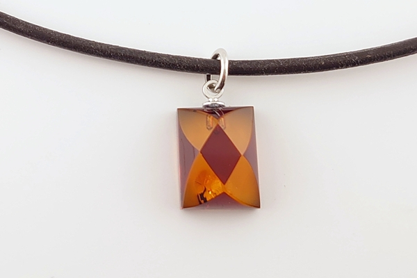 ダイヤ柄になるようにカットを施した、コニャックカラーの海外産琥珀のペンダントです。
