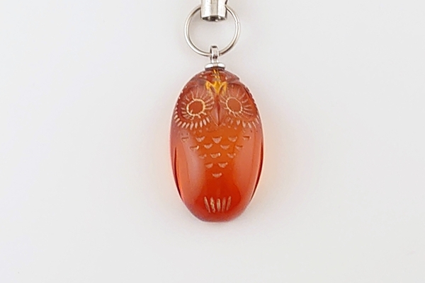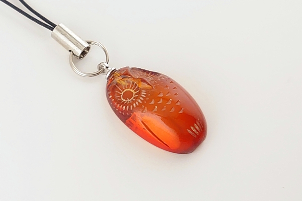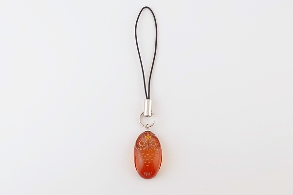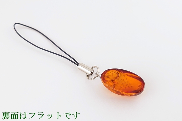 海外産琥珀に、ふくろうを彫刻したストラップです。
