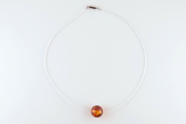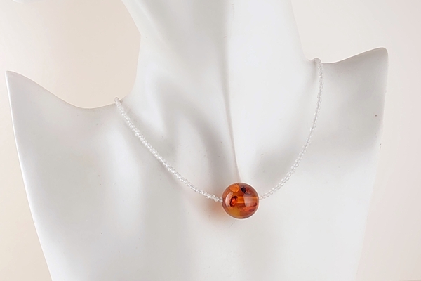 濃淡のある内包物が浮かび上がる、海外産琥珀の丸玉に、清楚な印象のクウォーツを組み合わせたネックレスです。