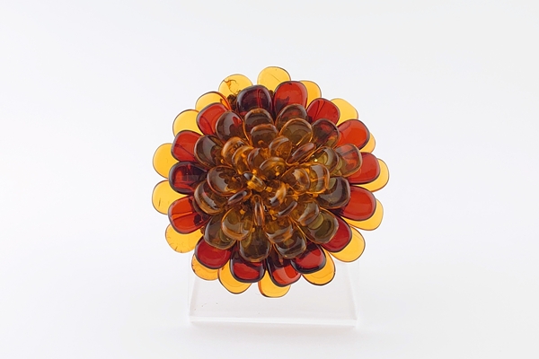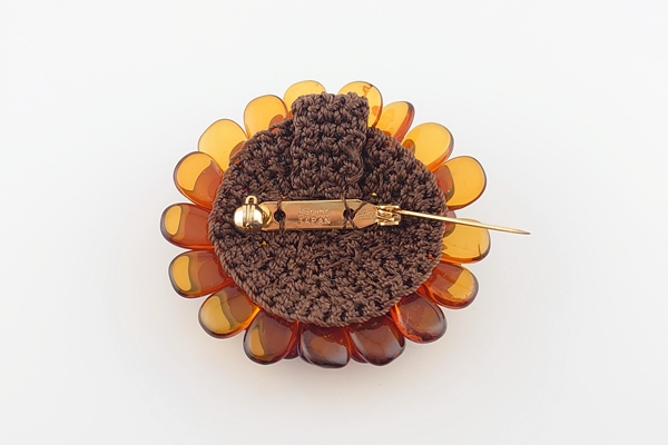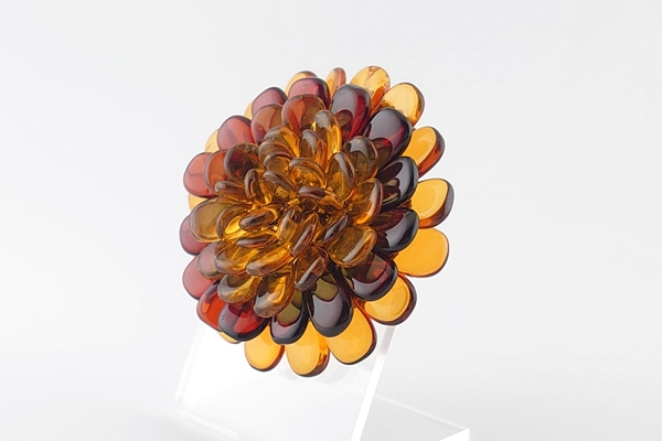 透明感のある2色の海外産琥珀のサザレを花びらに見立て、丁寧に編み込んでいます。