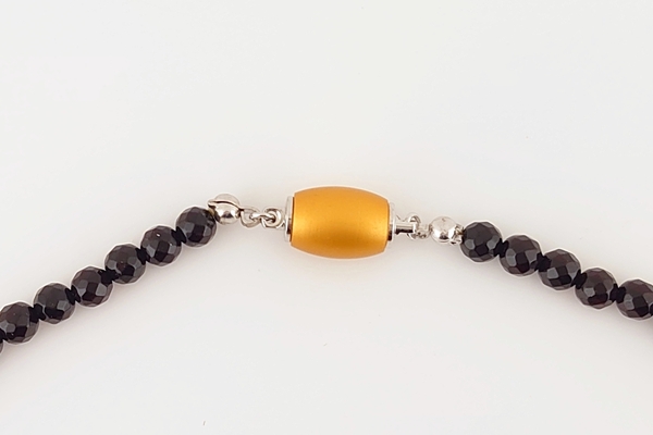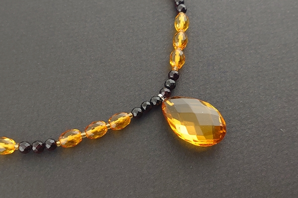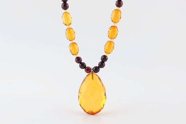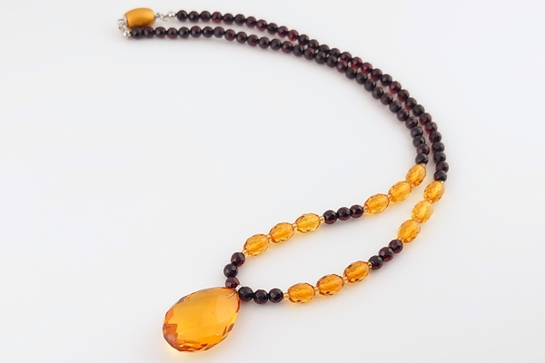 コニャックとワインカラーの2色の琥珀に、ミラーカットを施したしずく型のパーツをセンターに配したネックレスです。
