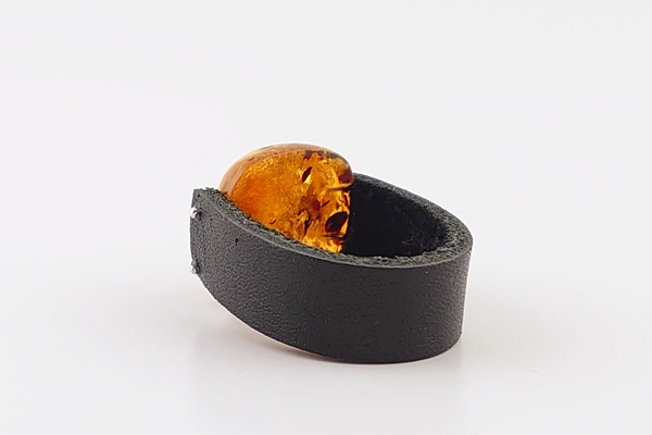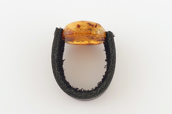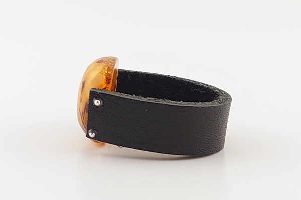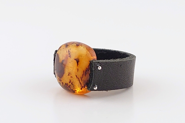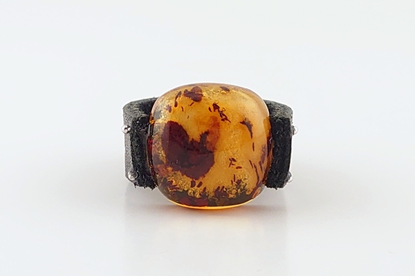 個性的な内包物が浮かぶ海外産琥珀を、柔らかな牛革でリングに仕立てました。