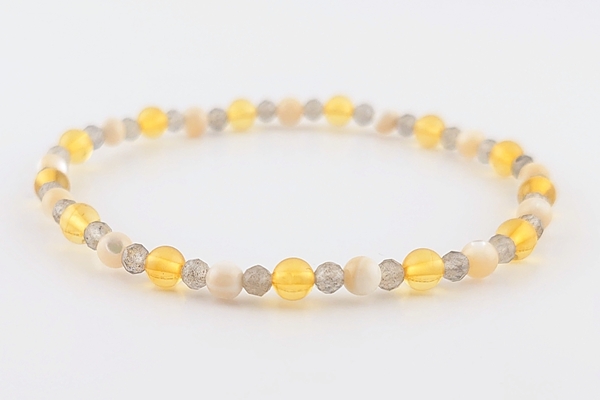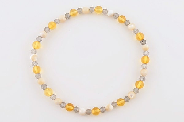 明るいコニャックカラーの琥珀に、柔らかなベージュ系の色合いの夜光貝と、ほのかなシラー効果が楽しめるラブラドライトを組み合わせました。