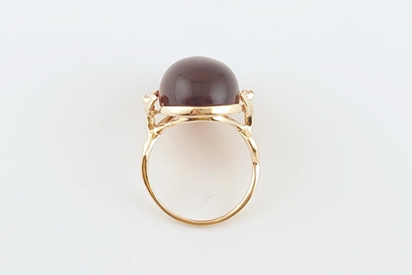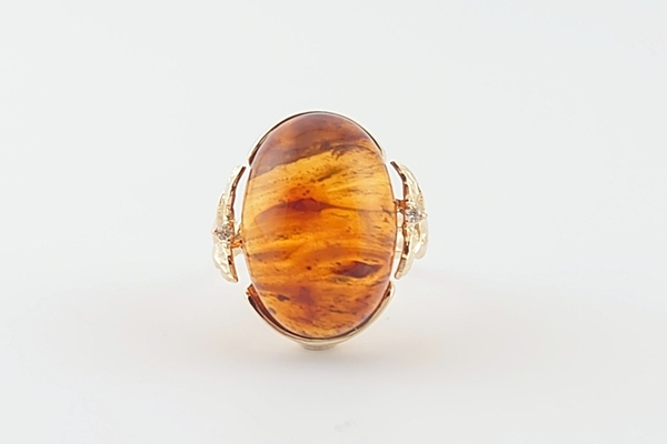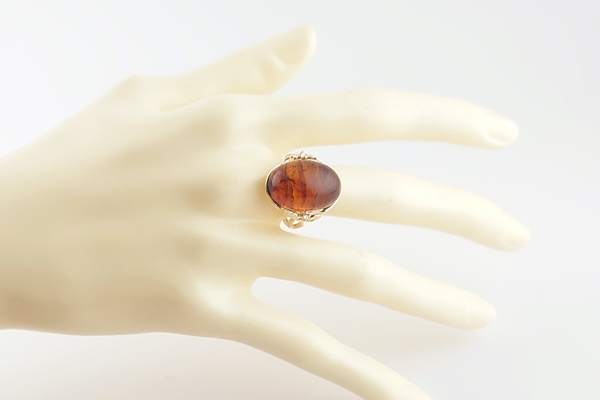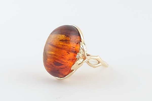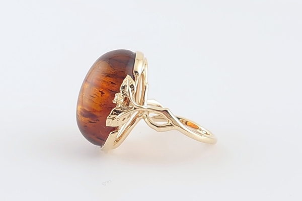 リング台座の裏を抜いているため、脇からのほのかな光も透かし、琥珀の存在感が際立ちます。