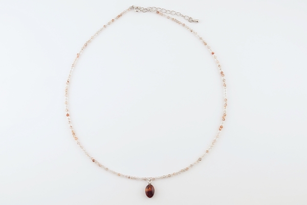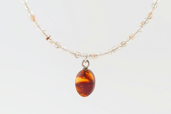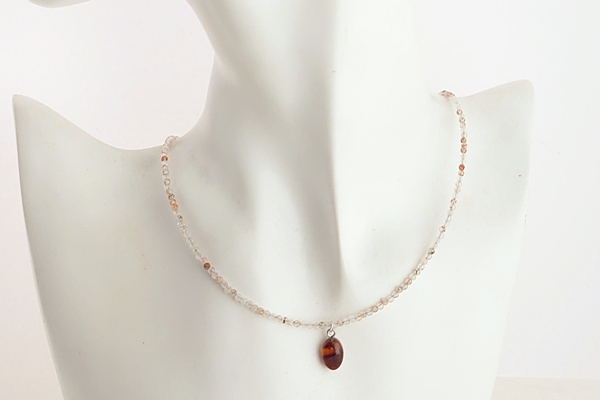 くっきりと縞目模様が浮かぶ久慈産琥珀に、透明からブラウン系の色合いが楽しめるコッパールチルを組み合わせたネックレスです。