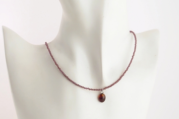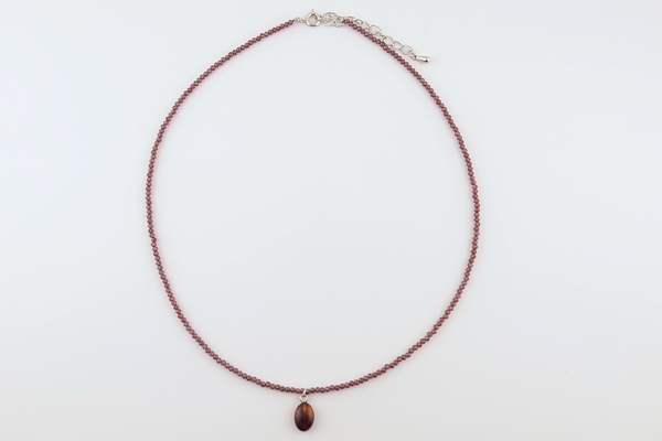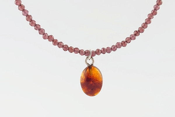 ローズブラウンのガーネットにマッチする、濃い目の縞目模様が浮かぶ久慈産琥珀を組み合わせたネックレスです。