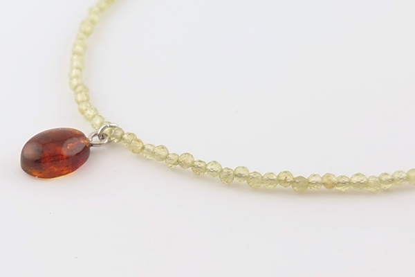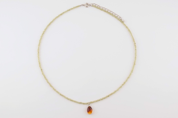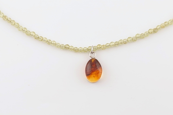 マスカットのような明るいカラーのペリドットに、透明感のある久慈産琥珀を組み合わせたネックレスです。